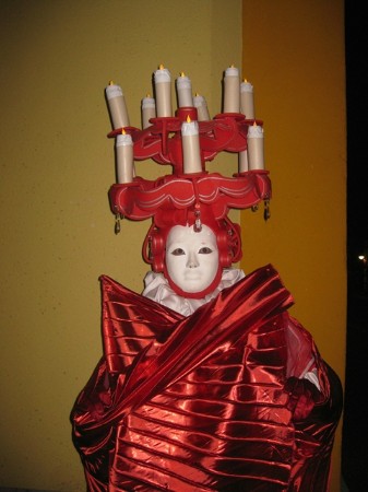 Kostüm mit einem roten Kronenleuchter als Kopfbedeckung. Die einzelnen Kerzen sind mit batteriebetriebenen Teelichtern versehen.