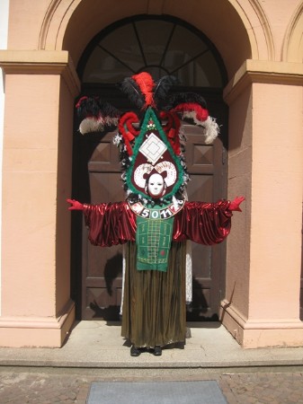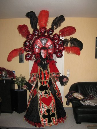 Kostüm mit Skatblatt, Mühlespiel, Würfelbecher und Roulettzubehör. Gesamthöhe des Kostümes liegt bei 300 cm.