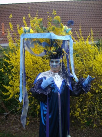 Frühlingskostüm in gelb/blau mit Frühlingsblumen und der Holzschritzug "FRÜHLING".