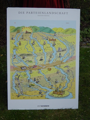 Das Plakat (80 x 120cm) bildet die Politische Land-schaft von 1848 bis heute ab. Es ist überparteilich gehalten und ist von oben nach unten zeitlich gegliedert. Die beiden Weltkriege sind mit auf-geführt, sowie die politische Situation in der ehe-maligen DDR. Markante Köpfe setzten Zeichen der jeweiligen Entwicklung. Die Entwicklung der Parteien mit deren Vorgängergruppierungen/Parteien sind als Flüsse dargestellt, welche alle um die Insel "Berlin" als heutigen Regierungssitz enden.