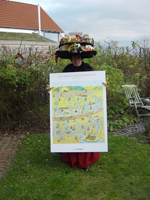 Grundlage für dieses Kostüm ist das "Deutschland Kostüm" mit derselben Kopfbedeckung. Von allen 16 Bundesländern ist eine kleine Fahne mit dem offiziellen Wappen des Bundeslandes. Dazu gibt es etwas "typisches" aus diesem Land. Es ist eine rein subjektive Auswahl. Bitte dies nicht ganz ernst nehmen. Viele Sachen haben etwas mit dem typischen Essen der Region zu tun. Einzelheiten finden Sie unter dem o.g. Themenkostüm "Deutschlandkostüm"